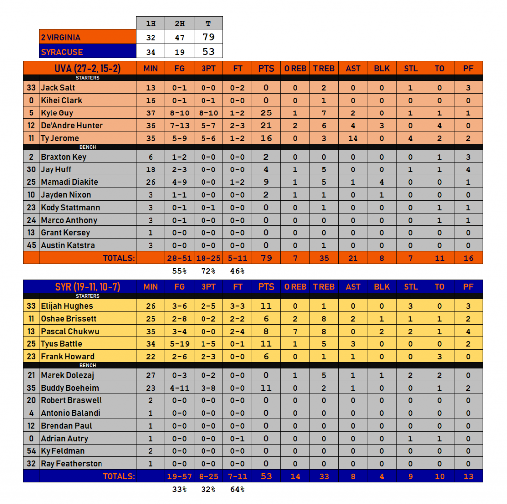 UVA outscored Syracuse 47-19 in the second half alone, shooting 62 percent from the floor (18 of 29) and 77 percent from distance (10 of 13) across the final 20 minutes while giving the ball away only three times after the break.