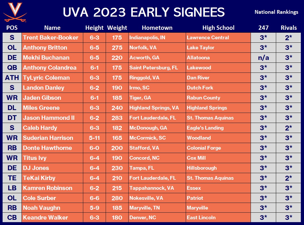 Virginia’s class included 13 offensive players and 10 defensive, including the four transfers. One of the needs that Elliott will have to address will be the cornerback spot after All-ACC corner Fentrell Cypress entered the transfer portal, something Elliott said surprised him (see a complete list of high school signees below).