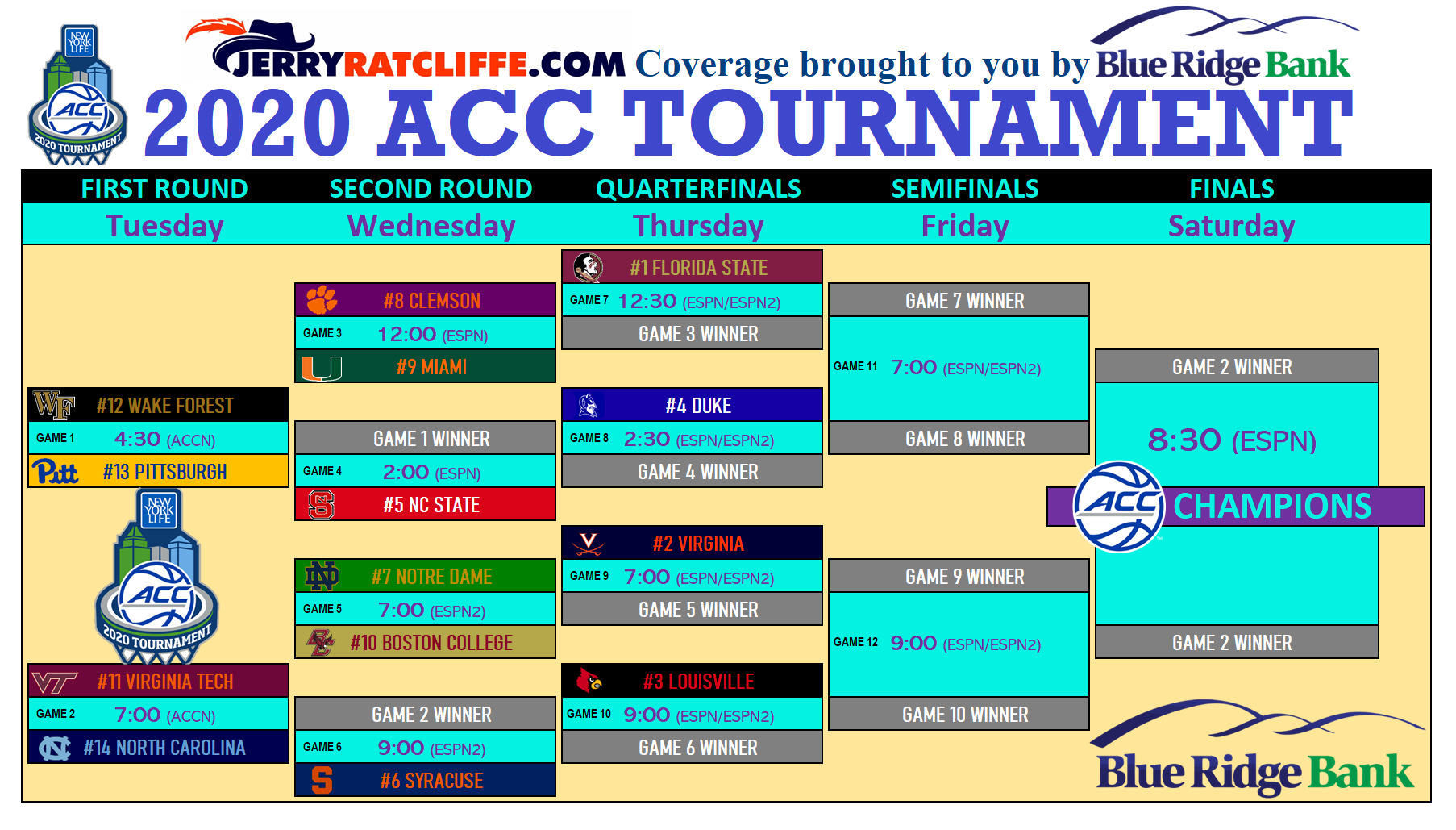 Here’s a statistical breakdown of all 14 schools competing for the 2020 ACC Men’s Basketball Tournament championship this week in Greensboro, brought to you by Blue Ridge Bank. It all gets under way this afternoon at the Greensboro Coliseum, while No. 2 seed Virginia will enjoy its hard-earned double bye and will face the Notre Dame/Boston College winner on Thursday at 7 p.m. Below, you can find the tournament bracket.
