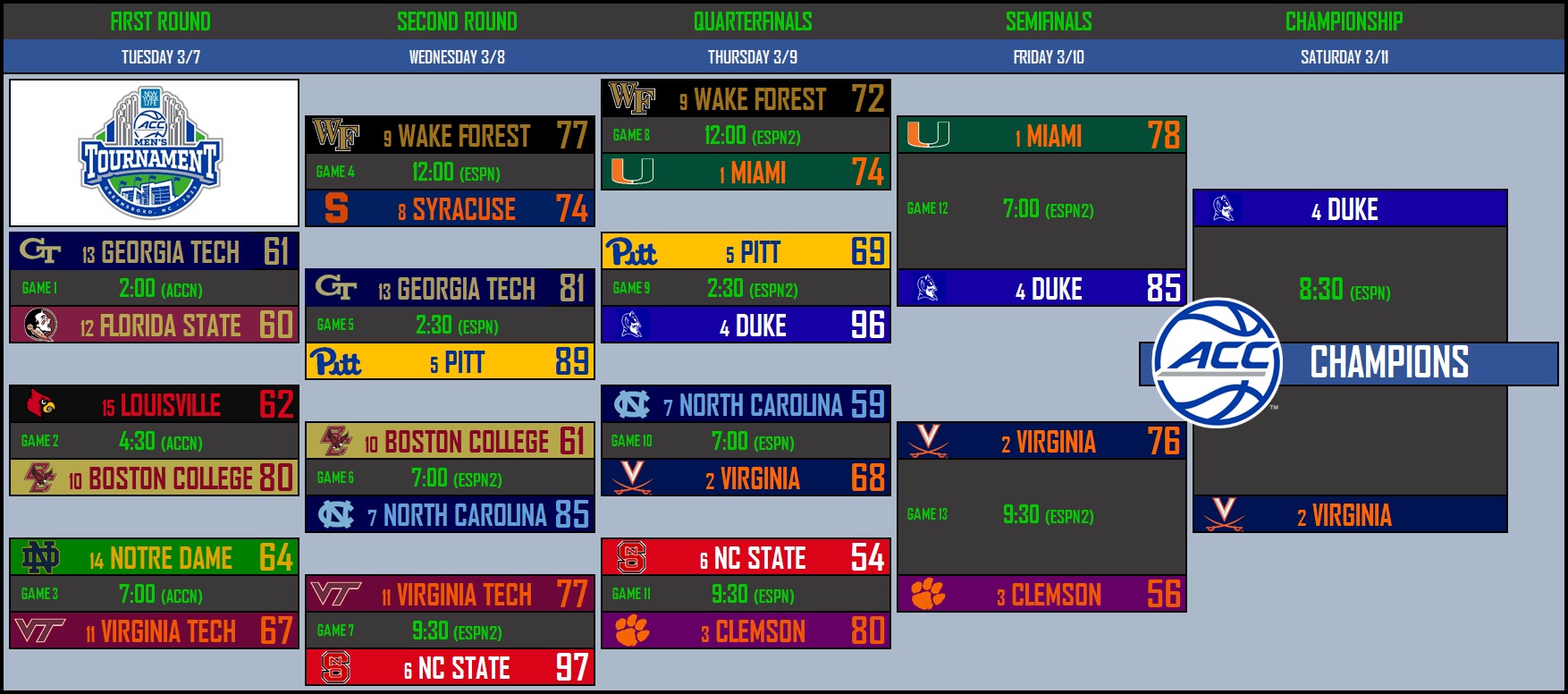 The Cavaliers (23-6, 15-5 ACC) will begin play on Thursday night at 7 p.m. in the quarterfinal round against either No. 7 seed North Carolina, No. 10 seed Boston College or No. 15 seed Louisville.