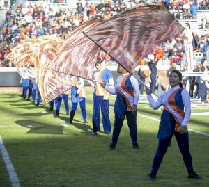 Orange flags were part of the Virginia band’s pregame show at the final home game of 2018 against Liberty (Photo by John Markon).