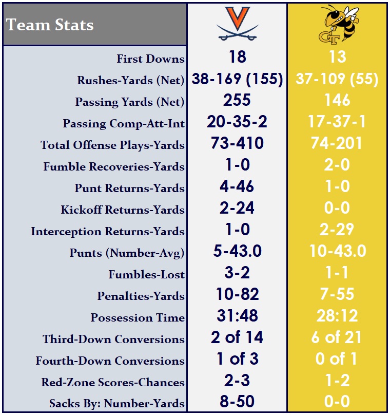 The Yellow Jackets (3-4, 2-2) lost starting quarterback Jeff Sims in the first half to an ankle injury, and produced just 201 total yards (2.7 yards per play) and 13 first downs on the evening. Virginia’s defense was solid, holding Tech to just 55 yards rushing and 146 through the air. The Hoos produced 8 sacks and 10 tackles for loss.