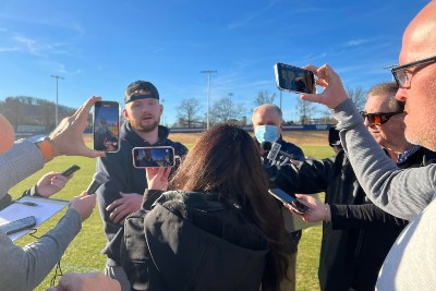 Brennan Armstrong talks with reporters after Virginia introduced Tony Elliott as the new head football coach. Photo by Crystal Graham.
