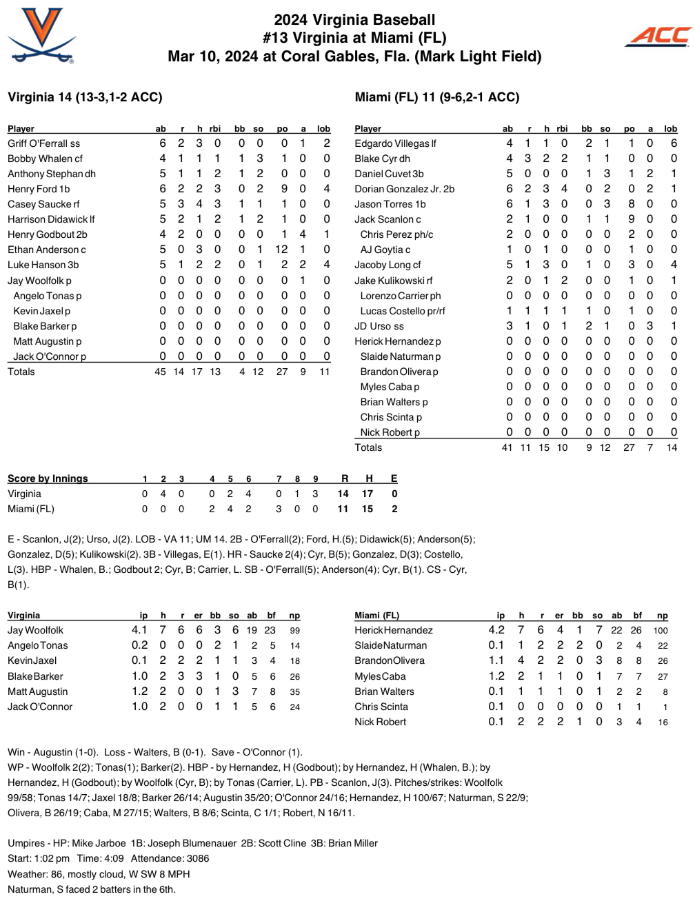 Virginia (12-3, 1-2 ACC) recorded its first ACC win of the season. With two outs and the scored tied at 11 in the ninth, Henry Ford singled home Griff O’Ferrall on ball that traveled a little more than 70 feet rolling into no man’s land between third base and the pitcher’s mound. Harrison Didawick followed with a two-run double to give the Cavaliers a three-run cushion.