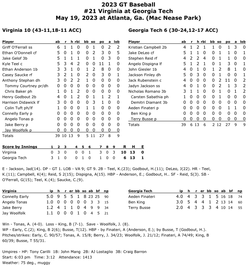 - UVA (43-11, 18-11 ACC) responded with three runs of its own in the top of the second inning. Stephan brought home two runs with single up the middle. UVA tied the game when Casey Saucke scored on a Georgia Tech fielding error.