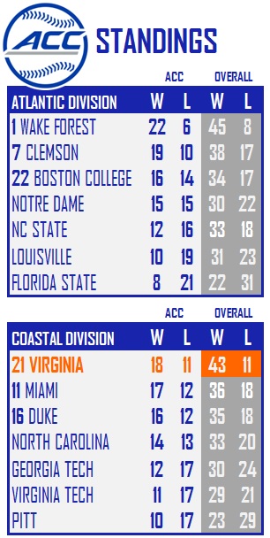 The regular season comes to a close on Saturday with the series finale against Georgia Tech. The Cavaliers will have RHP Brian Edgington on the mound and he will be opposed by RHP Jackson Finley. First pitch is scheduled for noon.