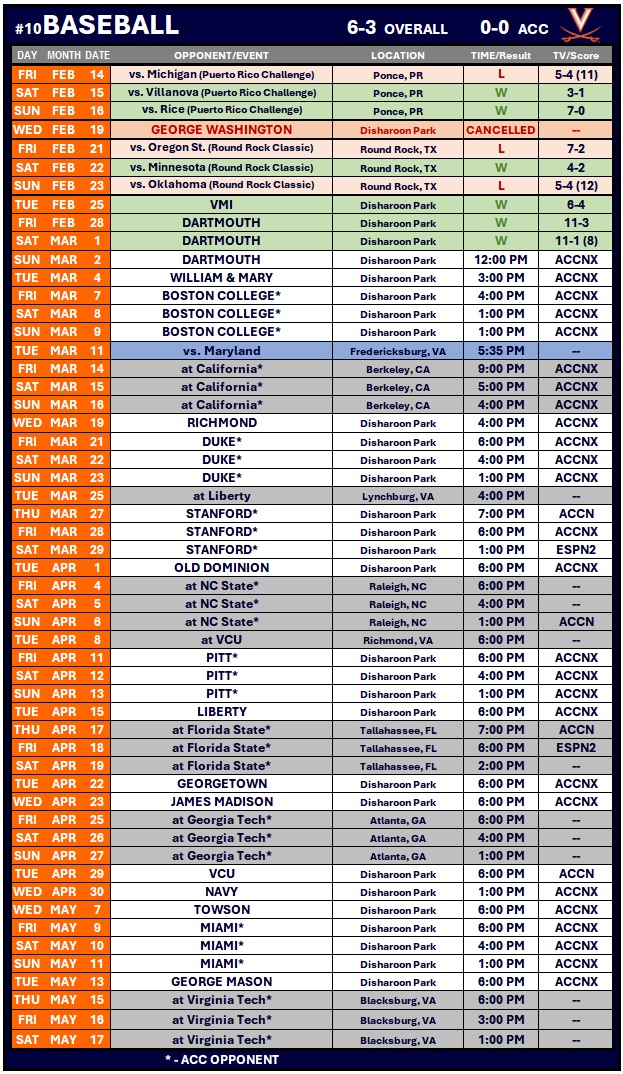 • Virginia has won 11-straight games over Dartmouth dating back to 1940 and 11-straight non-conference weekend series at home.