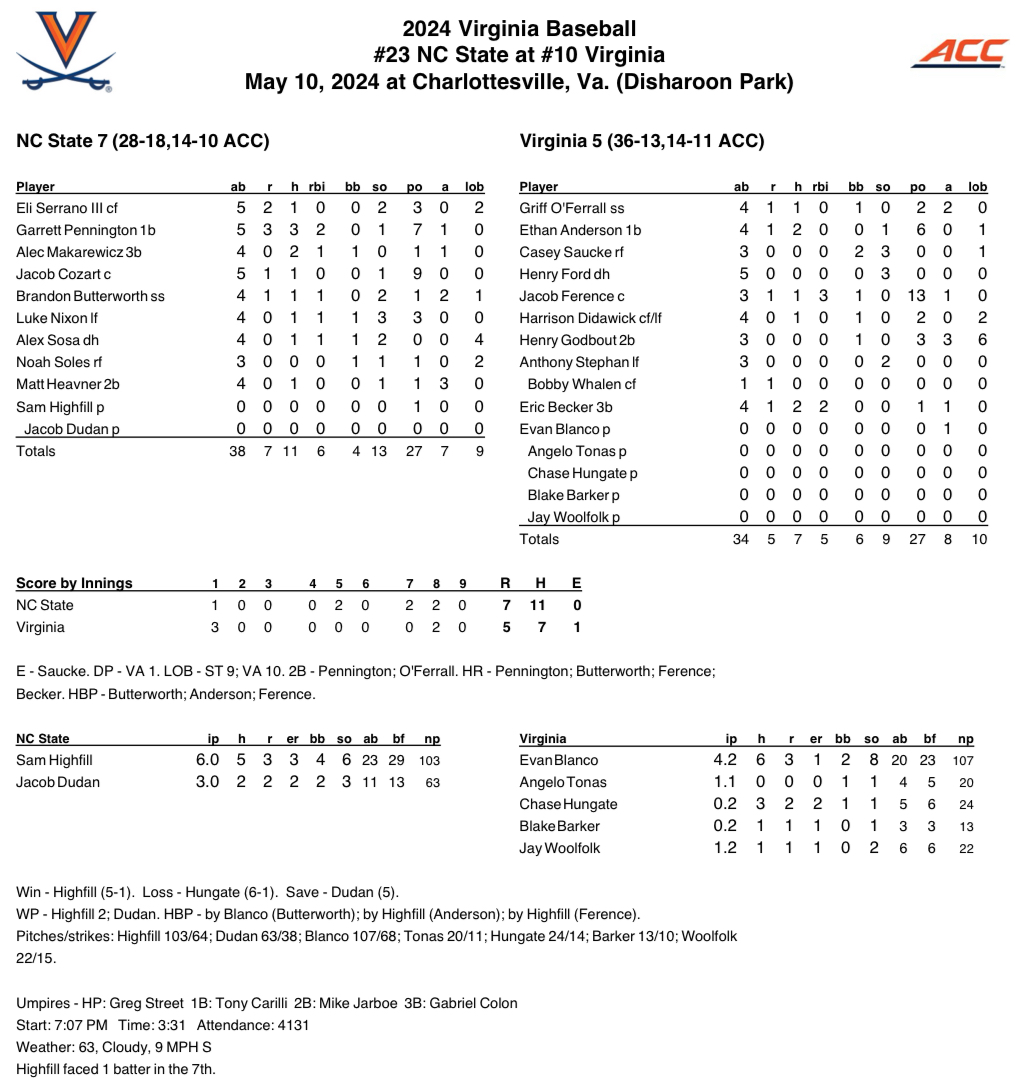 The Wolfpack (28-18, 14-10 ACC) erased an early 3-1 deficit by scoring straight runs and hung on for the two-run victory. NC State starting pitcher Sam Highfill turned in the quality start (6.0 IP, 3 ER, 6 SO) and reliever Jacob Dudan held the Cavalier offense at bay with the three-inning save.