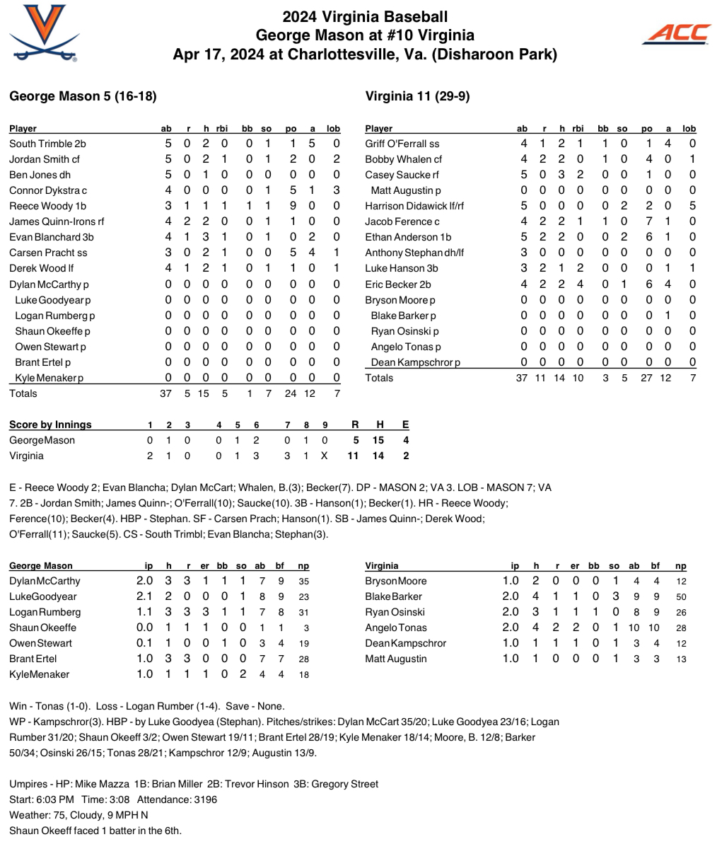 No. 10 Virginia bounced back from Tuesday’s loss to ODU with an 11-5 win over George Mason on Wednesday at Disharoon Park. The Cavaliers racked up 14 hits and scored double-digit runs for the 20th time this season.