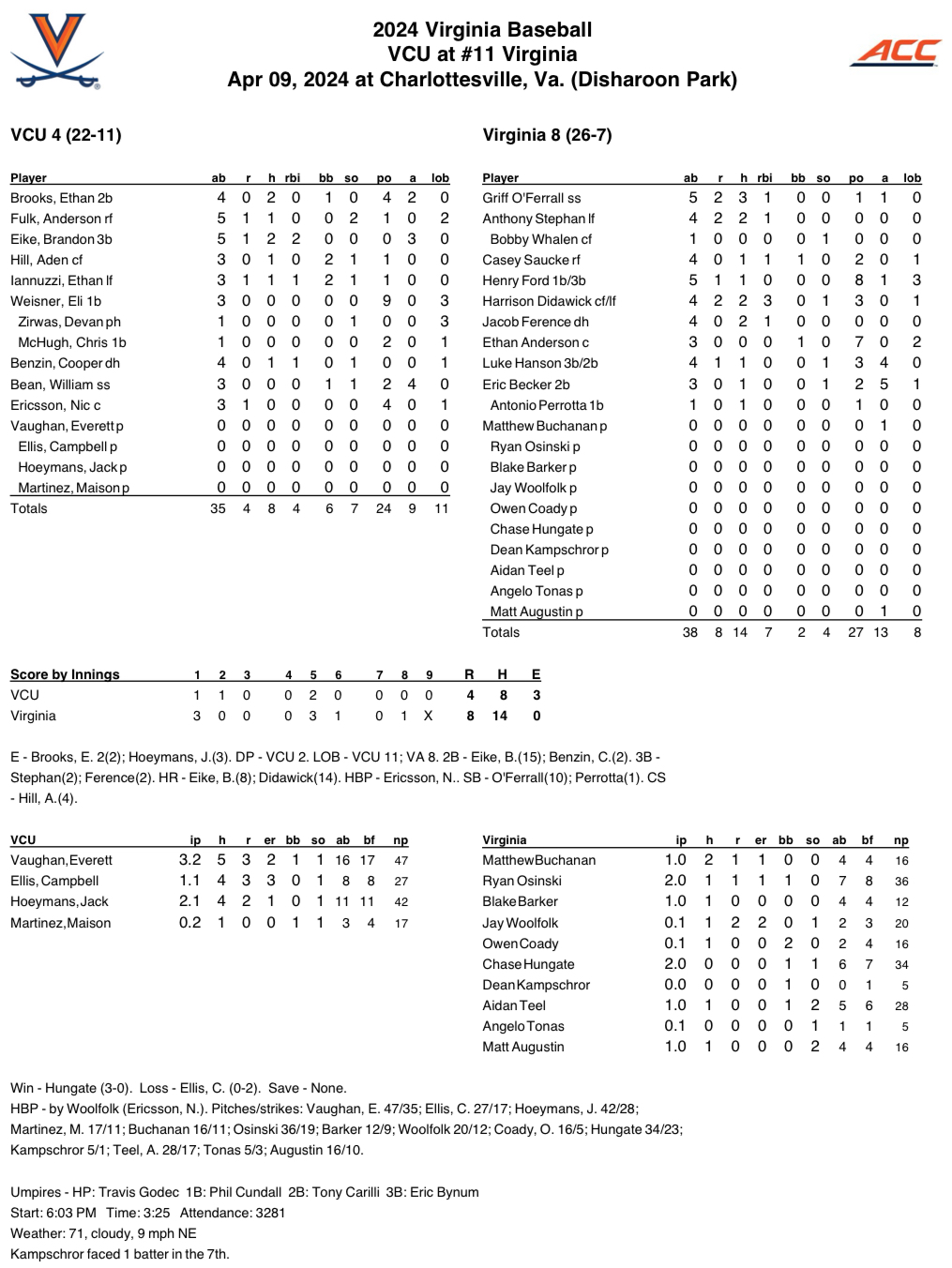 The Cavaliers used a season-high 10 pitchers in the contest and Ryan Osinski and Hungate were the only arms to log multiple innings.