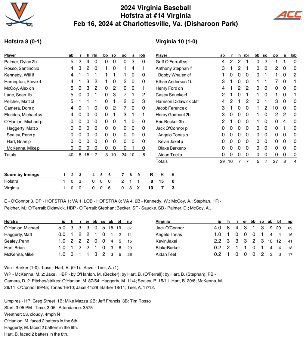 Baseball: No. 14 UVA hangs on for 10-8 win over Hofstra to open 2024 season