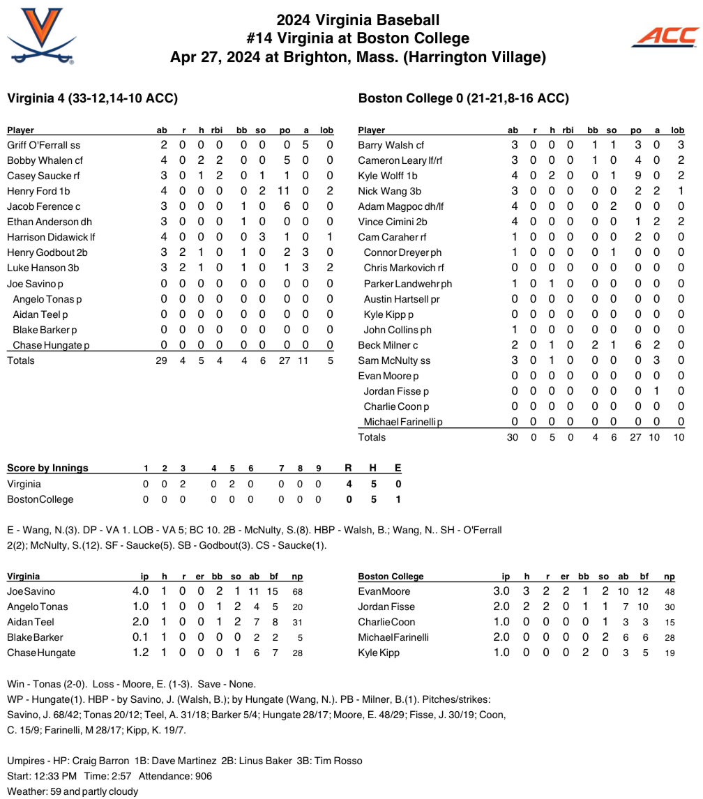 Five pitchers combined for a five-hit shutout as No. 14 Virginia picked up the series victory Boston College with a 4-0 victory on Saturday. The Cavaliers recorded their third shutout of the season and the first against an ACC opponent since blanking NC State on March 17, 2023.