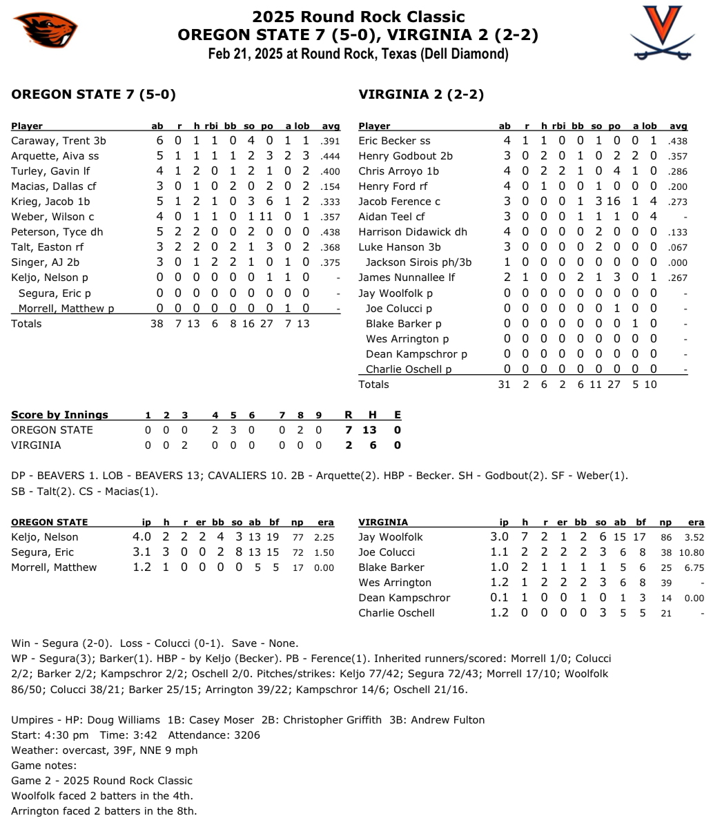 Virginia (2-2) plated the first two runs of the game on a Chris Arroyo RBI single in the third inning before Oregon State scored the final seven runs to claim victory.