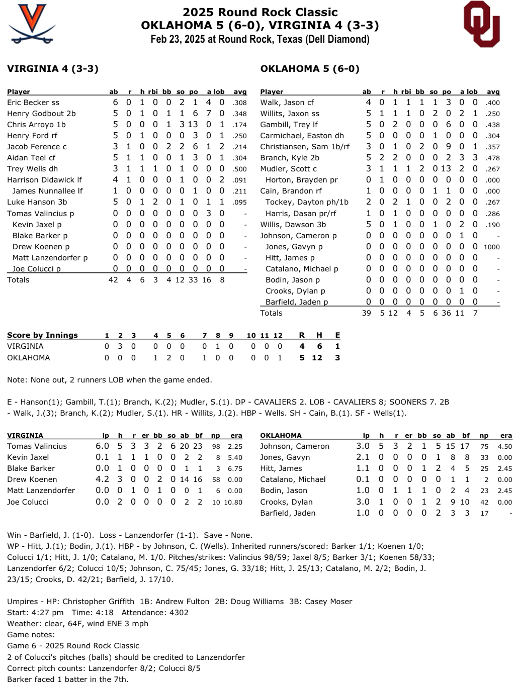 In the longest game in the history of the Round Rock Classic, No. 2 Virginia dropped a 12-inning affair by a score of 5-4 to Oklahoma on Sunday at Dell Diamond.