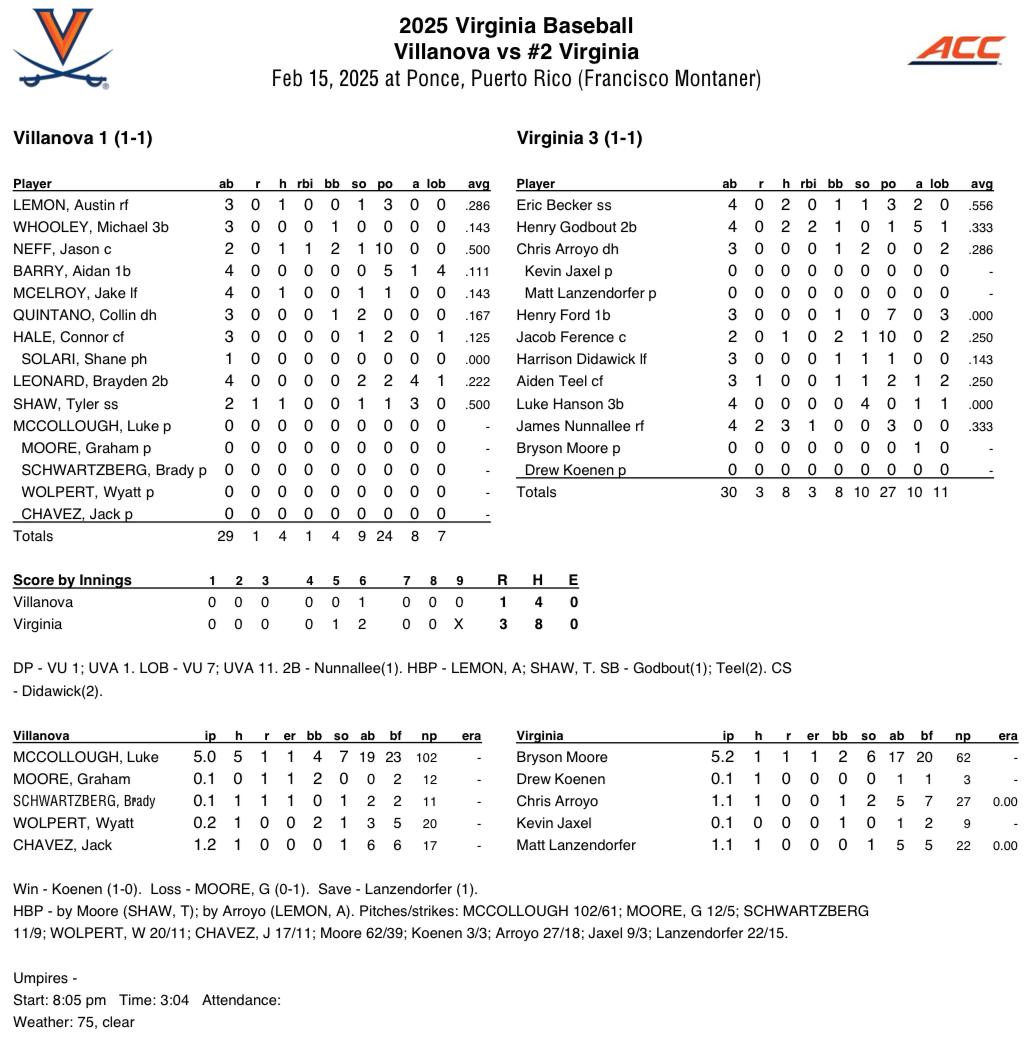 On the second day of the Puerto Rico Challenge, the No. 2 Virginia Baseball team prevailed 3-1 over the Villanova Wildcats on Saturday at Estadio Francisco Montaner in Ponce, Puerto Rico.