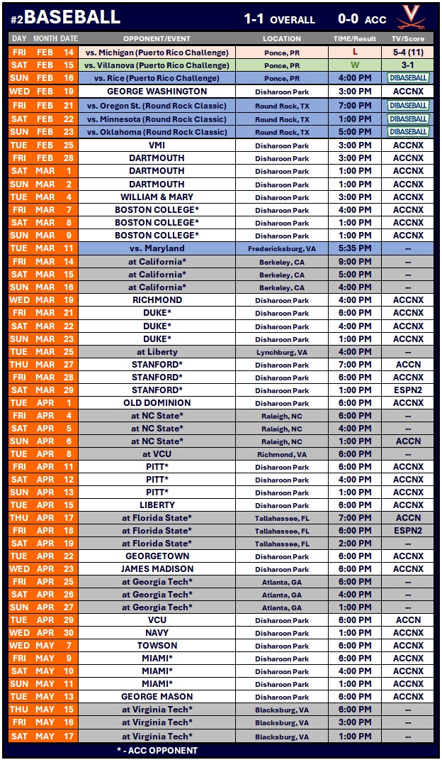 In his UVA debut, Drew Koenen picked up the win for the Cavaliers and Matt Lanzendorfer grabbed his first save in a Virginia uniform after securing the Cavalier victory. Virginia starting pitcher Bryson Moore struck out a career-high six batters in 5.2 innings of one-run ball but did not factor into the decision.