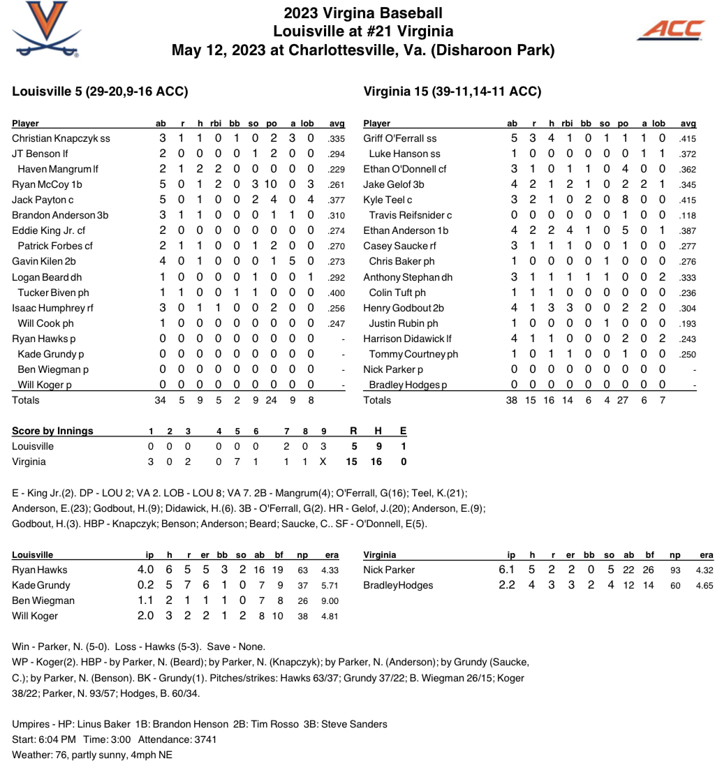 No. 21 Virginia scored the first 13 runs, 12 with two outs, in a 15-5 series-opening win over Louisville on Friday at Disharoon Park. Virginia won its 30th home game of 2023, the most in a season since 2013.