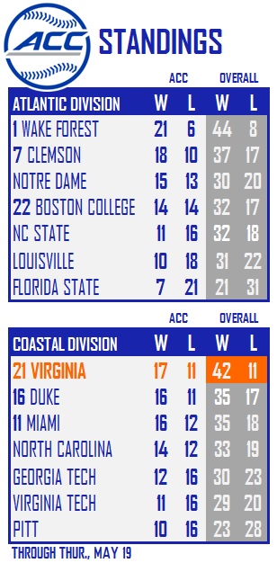 Kyle Teel drove in four runs in a 1-for-4, two-run effort at the plate. He gave UVA (42-11, 17-11 ACC) the initial lead with a three-run homer in the first inning, his 10th long ball of the season. Casey Saucke went 3 for 5 with three RBI and Ethan O’Donnell collected three hits including his 11th home run of the season.