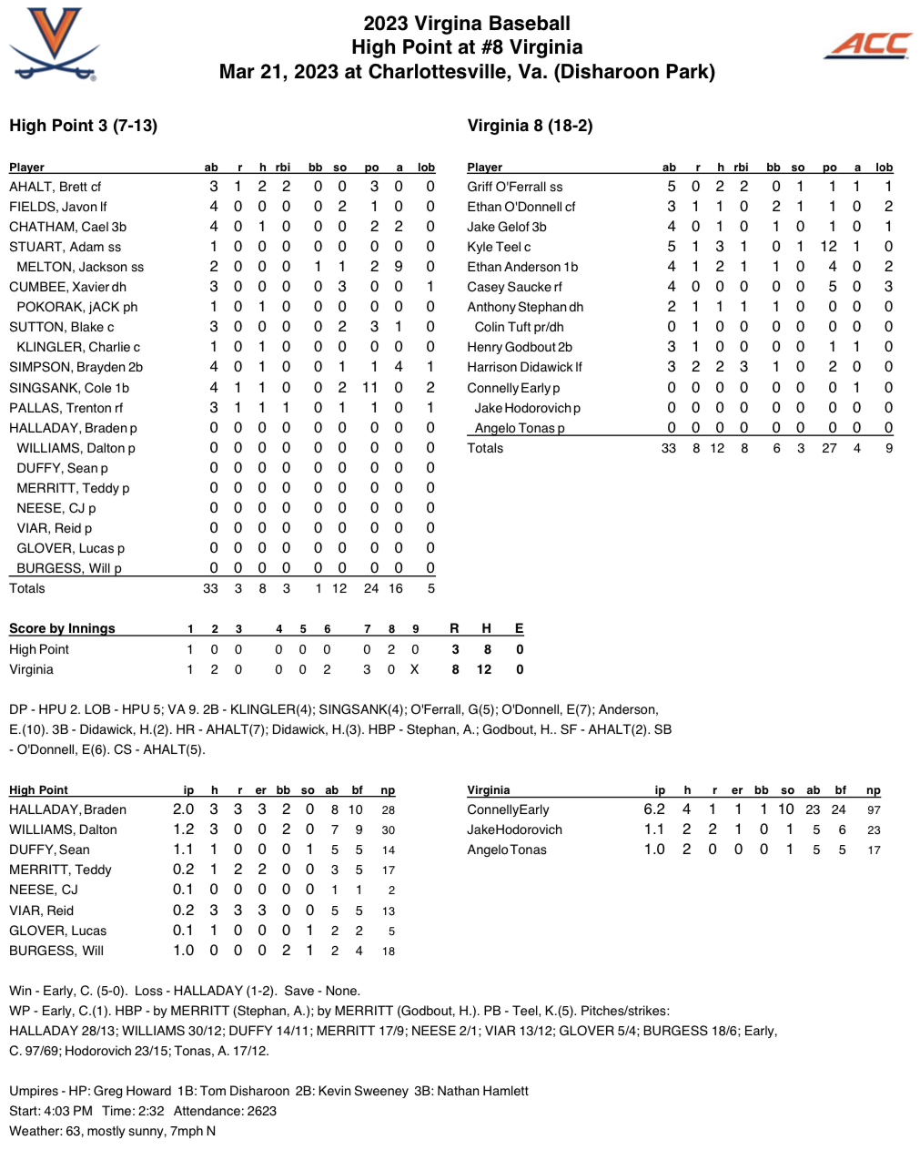 No. 8 Virginia kicked off its six-game homestand with an 8-3 win over High Point on Tuesday at Disharoon Park. The Cavaliers (18-2) improved to 12-0 at home this season and have won 13-straight home games dating back to last season.