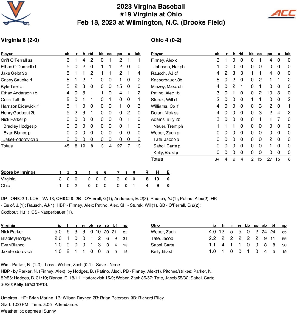 No. 19 Virginia scored all its runs with two outs in an 8-4 win over Ohio on Saturday at the Hughes Brothers Challenge in Wilmington, N.C. Led by starting pitcher Nick Parker, who had 10 strikeouts in five innings of work, Virginia pitchers struck out 15 batters in the contest.