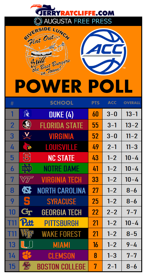 EDITOR’S NOTE: Today’s piece kicks off our new weekly ACC Power Poll, with our four expert panelists rating the league’s 15 teams. Beginning with next week’s poll, brought to you by our friends at Riverside Lunch, it will be accompanied by Ratcliffe’s Scattershooting around the ACC, an insider’s look at the league you love.