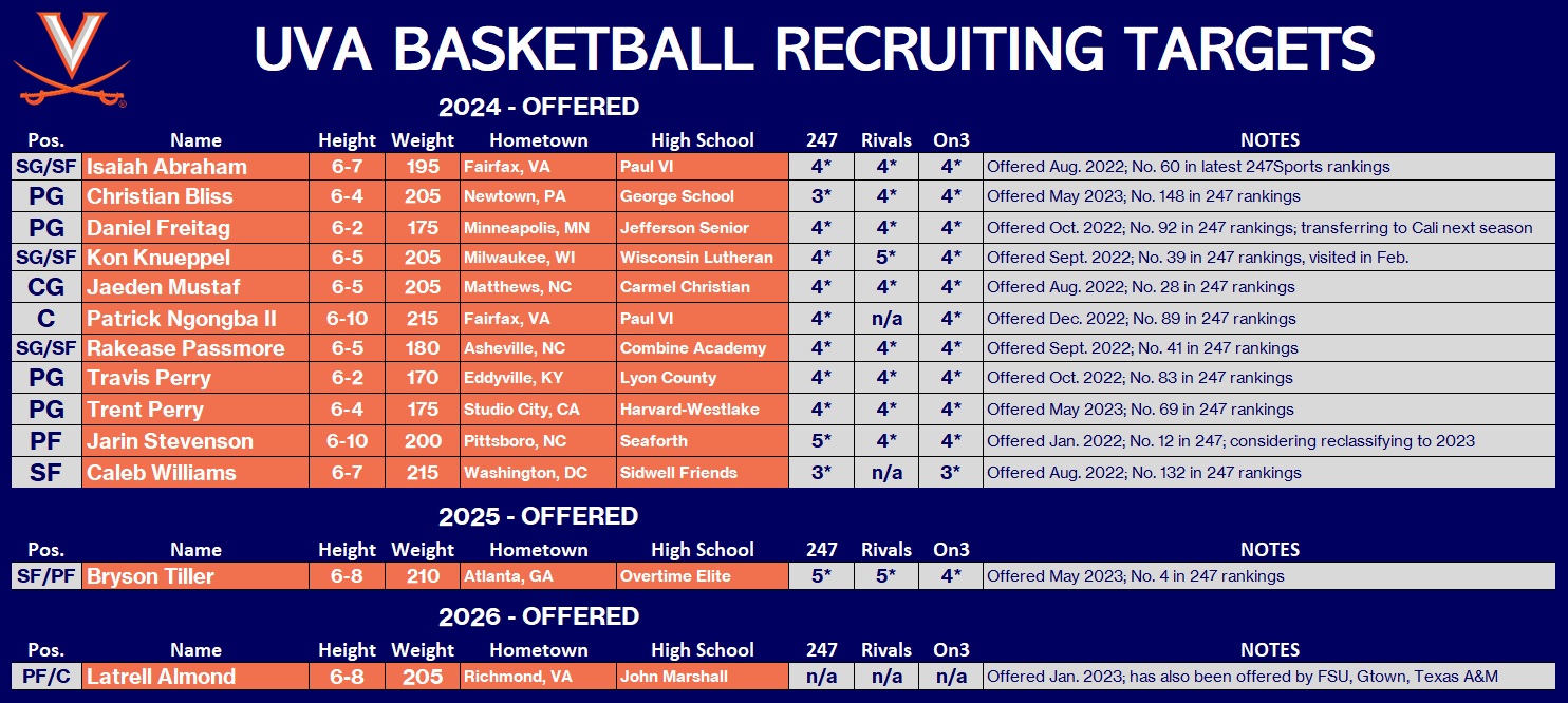 Bennett and the UVA staff have offers on the table for three other 4-star point guards for the ‘24 class — Travis Perry (no relation) from Kentucky; Daniel Freitag from Minnesota; and, most recently, Christian Bliss from Pennsylvania.