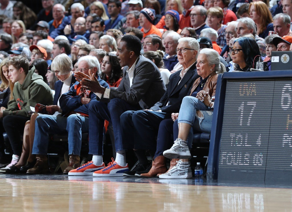 Former UVA head coach Terry Holland watches the Duke game with his wife, Ann, and his former three-time player of the year, Ralph Sampson (Photo: Matt Riley, UVA Athletics).