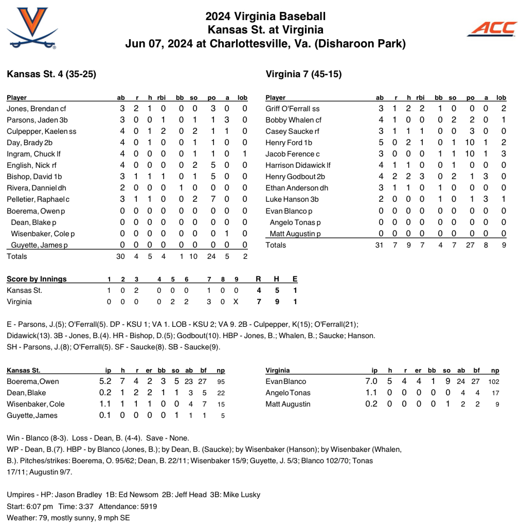 Blanco, Godbout star as Virginia opens Super Regional with 7-4 win over K-State