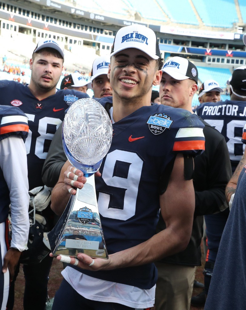 Cavalier safety Joey Blount poses with the Belk Bowl trophy in December (Photo by Matt Riley, UVA Media Relations).