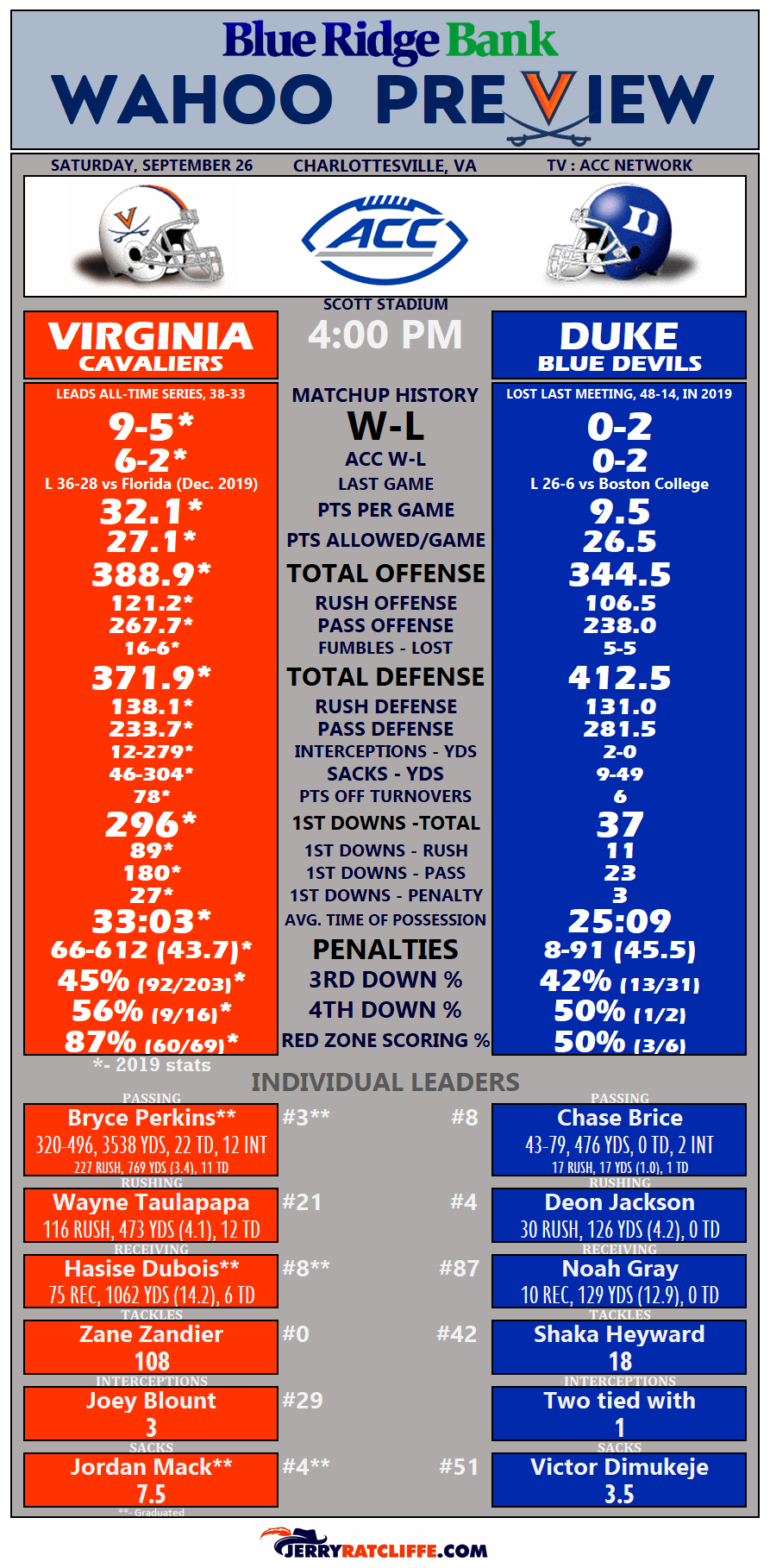 The Cavaliers look to make it six straight victories over the Blue Devils (0-2, 0-2 ACC), who are visiting Scott Stadium for the second year in a row, only this time, things will look much different in many ways.