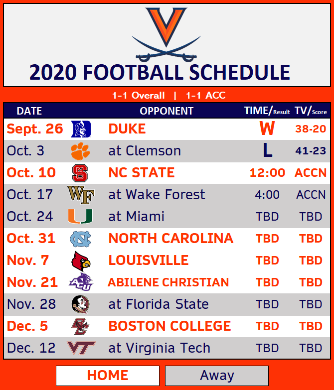 Virginia — lost at Clemson, 41-23: