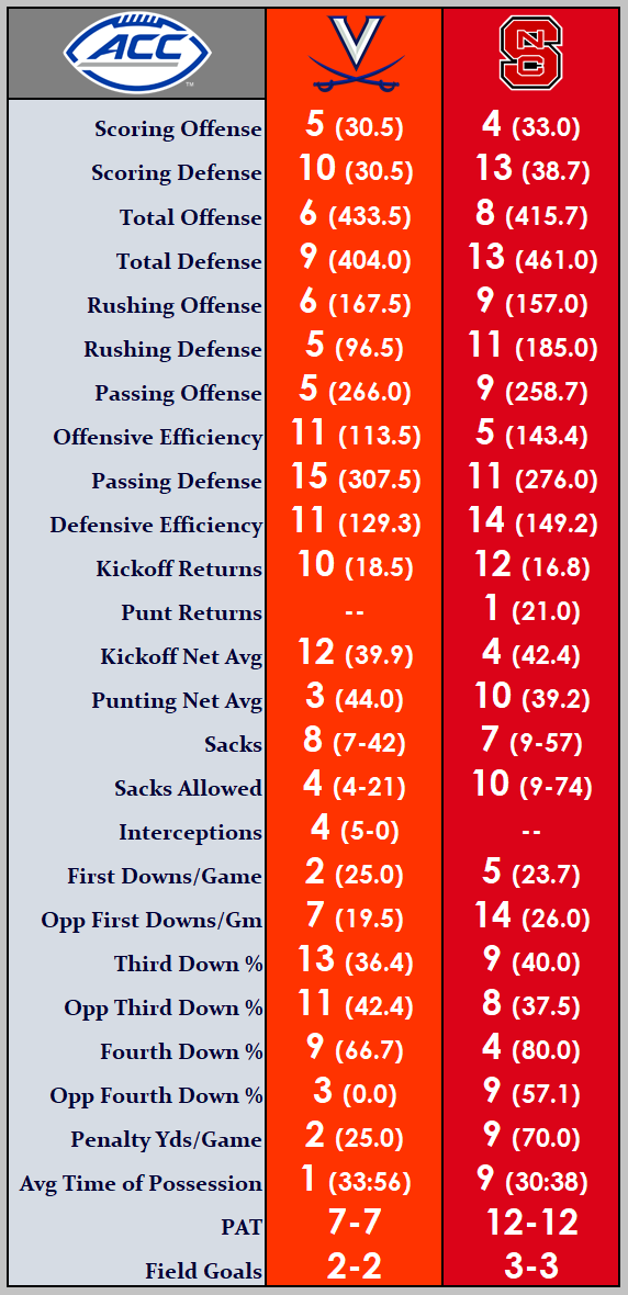 As of this writing, UVA is right around a touchdown favorite to beat the Wolfpack. Here’s a look at where each team ranks in the statistical categories of the 15-team ACC:
