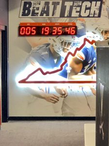 A countdown clock shines brightly inside the Virginia locker room at Scott Stadium where the Cavaliers are unbeaten (6-0) this season.