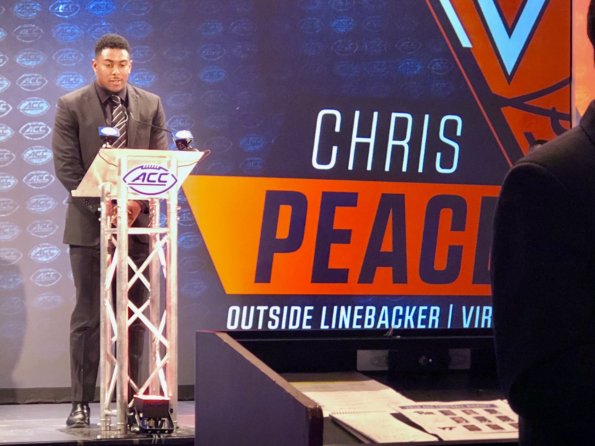 But there are several others on defense that Peace is hyping up heading into September and beyond. He believes the unit is “in a way better position” depth-wise with a lot of guys gaining experience a year ago. Peace says he’s eager to play alongside fellow senior linebacker Malcolm Cook, as well as Snowden and Jordan Mack, and that second-year cornerback Joey Blount will need to grow up fast as he rotates in at safety along with Juan Thornhill, Chris Moore and ACC Rookie of the Year Brenton Nelson.