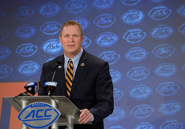Virginia head coach Bronco Mendenhall addresses the media during the 2019 ACC Football Kickoff in Charlotte, N.C., Thursday. (Photo by Sara D. Davis, the ACC)