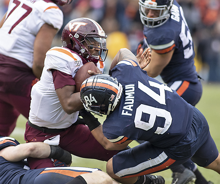 Aaron Faumui (91) crashes into the Virginia Tech backfield to sack QB Hendon Hooker in the final minutes of last season’s big win over the Hokies (Photo: John Markon).