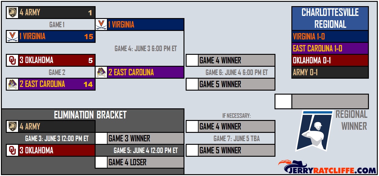 First pitch from Disharoon Park for the Pirates-Sooners game is scheduled for 7 p.m., as the Cavaliers will rest up and await the winner on Saturday evening.