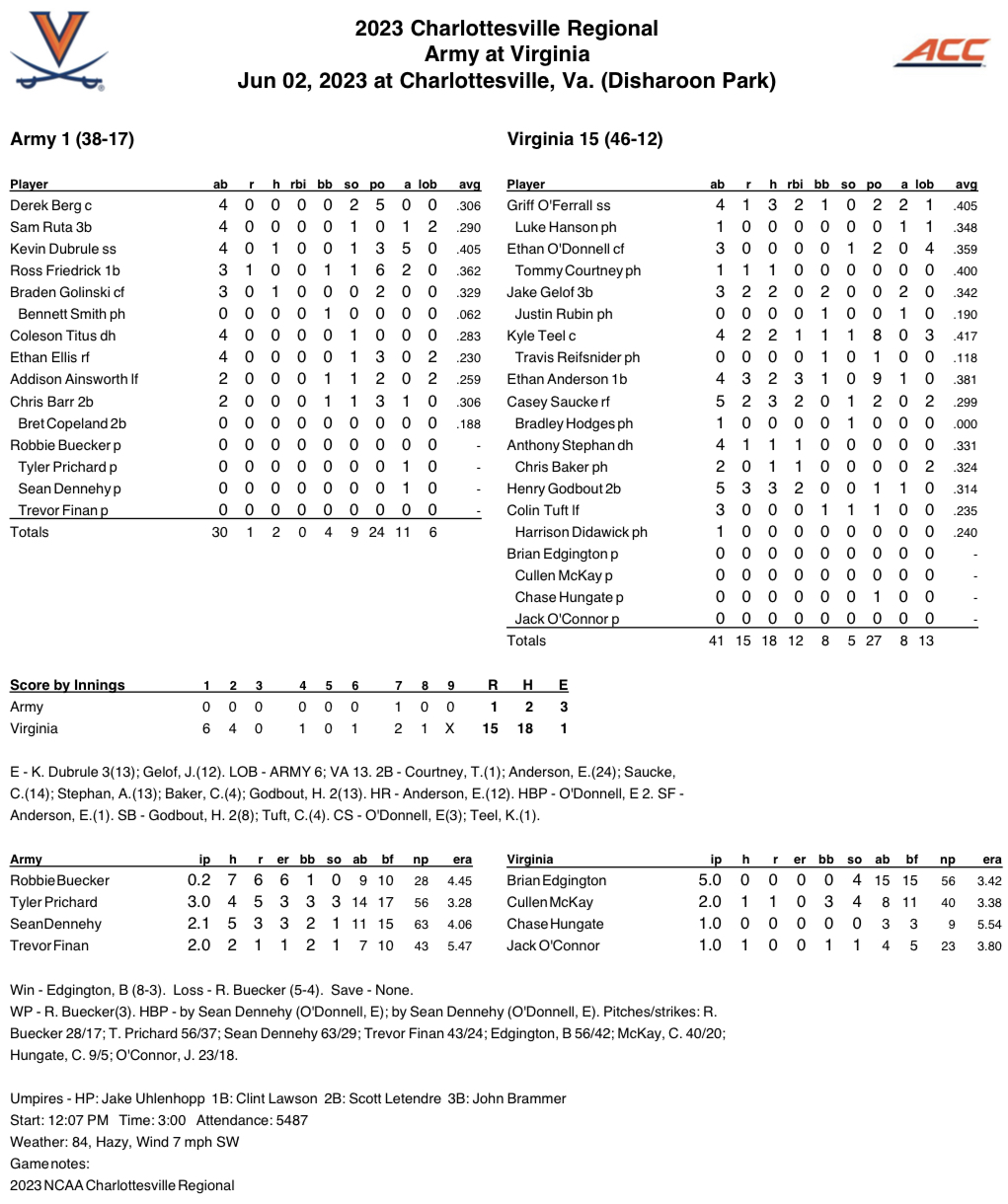 The Wahoos (46-12) cranked out 18 hits on the day, while limiting the Black Knights (38-17) to one unearned run on just two hits, and struck out nine Army batters. UVA moves on to the winner’s bracket and will take on either No. 2 seed East Carolina or No. 3 Oklahoma on Saturday at 6 p.m.