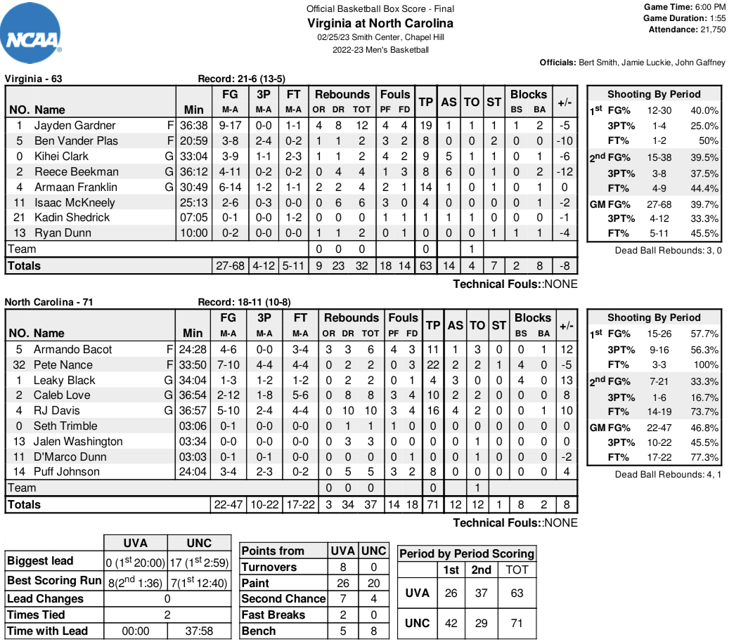Had even just a few of those shots fallen, Virginia fans could’ve instead been celebrating a season sweep of the Tar Heels and a tie back in first place with Pitt, but it simply looked like there may have been an invisible lid on the Hoos’ basket for the majority of the contest.