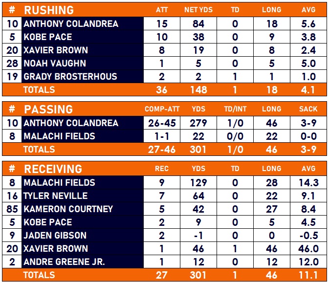 Colandrea completed 26 of his 45 attempts for 279 yards, while also leading the team in rushing with 84 yards on 15 carries. Sanker racked up 11 tackles (8 solo) to lead the defensive effort.
