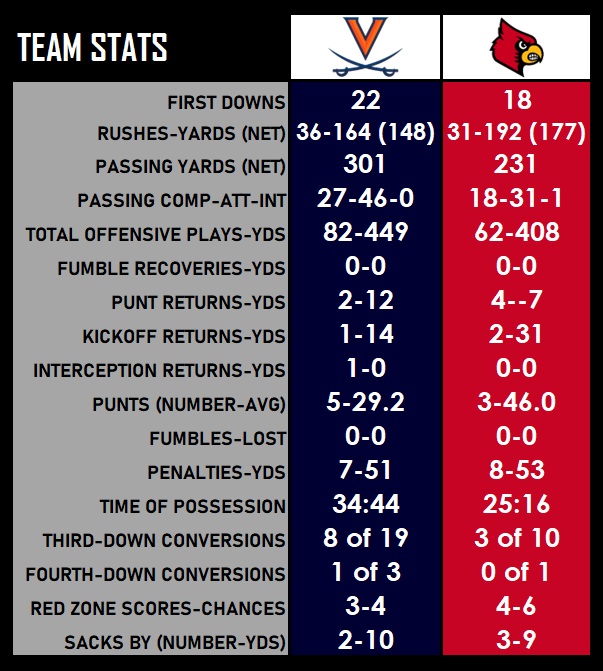 • Virginia outgained Louisville 449-408 in total offense and 301-231 in passing yards, which marks the second-straight season UVA outgained the Cardinals in total offense and passing.