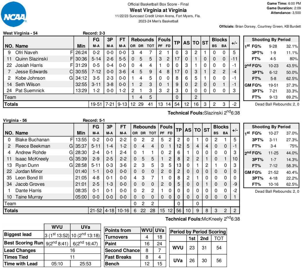 The Cavaliers made 10 of their 16 free-throw tries (63 percent) and turned the ball over 9 times. Once again, Virginia got crushed on the boards, 41-28, including a 12-6 deficit on the offensive glass (WVU had 8 second-chance points).