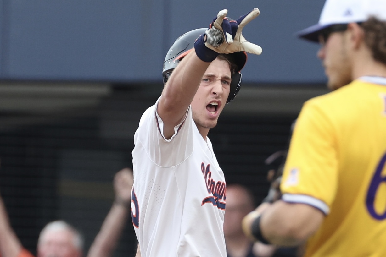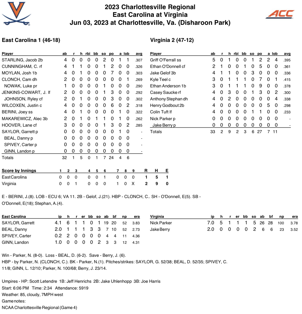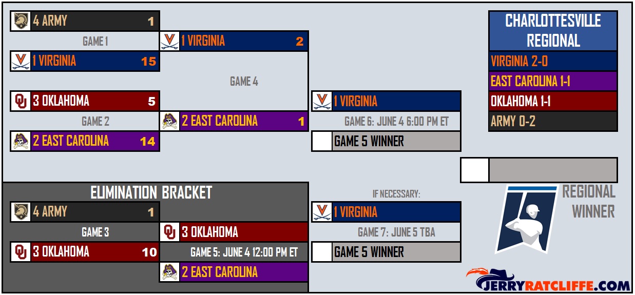 Virginia moves on to Sunday’s 6-p.m. contest with favorable odds to punch its ticket to the Super Regional round next week, as the Wahoos would have to lose Sunday and then again Monday (if necessary) in order to be eliminated. The Cavaliers will face the winner of the ECU-Oklahoma elimination game (Sunday, Noon), and whoever prevails between the Pirates and Sooners would need a second win Sunday night against UVA in order to force a seventh and deciding game to determine the weekend champion.