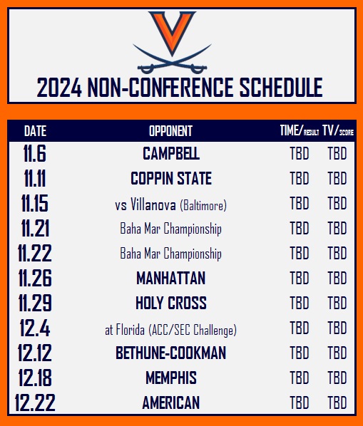 UVA also hosts Campbell (Nov. 6), Coppin State (Nov. 11), Manhattan (Nov. 26), Holy Cross (Nov. 29), Bethune-Cookman (Dec. 12) and American (Dec. 22) at John Paul Jones Arena.