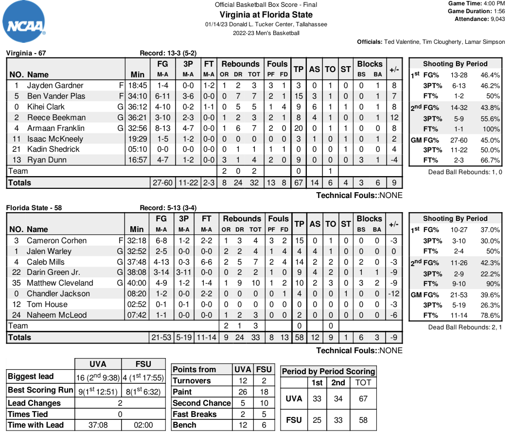FSU connected on 5 of its last 7 shots of the half, but still trailed by eight, 33-25, going into the locker room. Virginia shot 46 percent in the half, both from the field (13 for 28) and from 3-point range (6 for 13), with Franklin (13 points) and Vander Plas (11) carrying the offensive load.