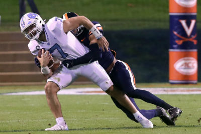 Charles Snowden sacks UNC QB Sam Howell in UVA’s 44-41 win. Photo courtesy Atlantic Coast Conference.