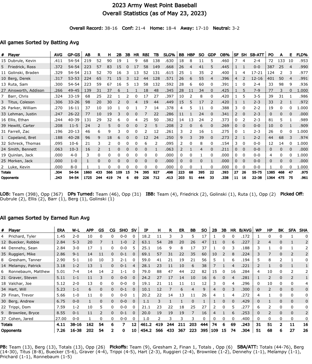 Top Batters: Sr. INF Kevin Dubrule (.411, 90 hits, 9 home runs, 68 RBI); Sr. 1B/C Ross Friedrick (.372, 83 hits, 17 home runs, 58 RBI); Jr. OF Braden Golinski (.329, 70 hits, 13 home runs, 52 RBI); Jr. INF Sam Ruta (.300, 67 hits, 13 home runs, 58 RBI).