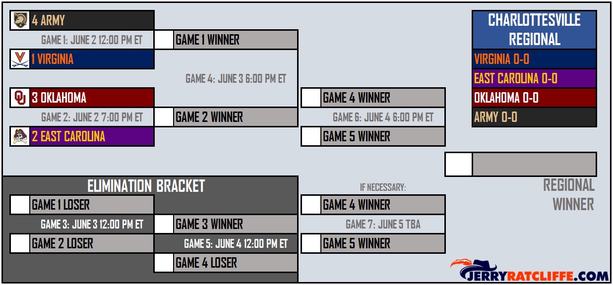 With the Charlottesville Regional getting underway on Friday at Disharoon Park, UVA will host Army at noon (ESPN+), and then East Carolina takes on Oklahoma at 7 p.m. (ESPN2) to determine which teams will move on to the winners bracket and which will be playing in an elimination game on Saturday afternoon.