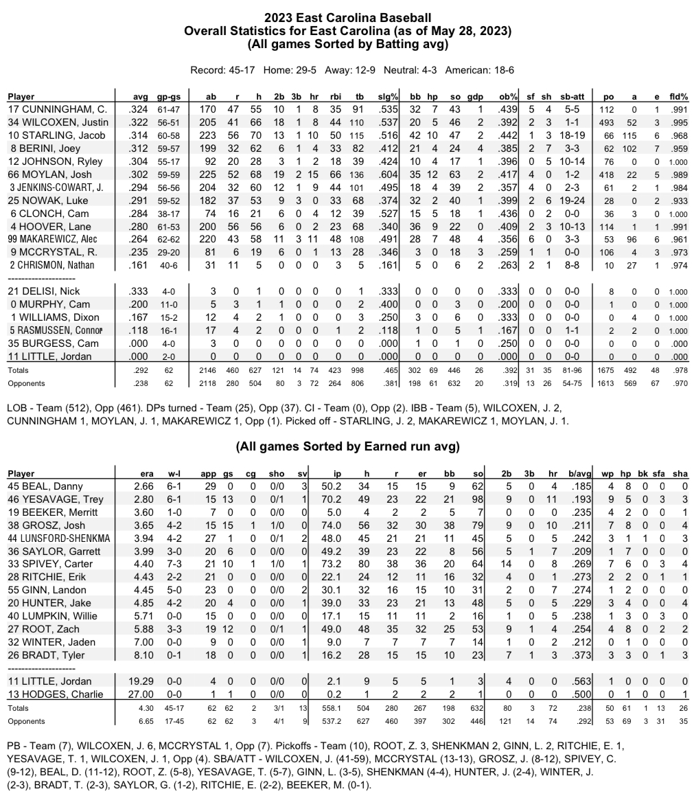 Overview: The Pirates, making their 33rd NCAA appearance in program history, had a chance to wrap up the AAC championship last weekend, but fell in the title game against seventh-seeded Tulane, 8-6. ECU finished 3-3 against ACC foes during the regular season (2-1 vs. North Carolina; 1-1 vs. NC State; 0-1 vs. Duke). The Pirates (No. 15) are the only team in the Charlottesville Regional ranked in the latest D1Baseball rankings other than No. 11 Virginia. The Pirates, who will be facing Oklahoma for the first time ever on Friday night, participated in the Charlottesville Regional in both 2011 and 2016.
