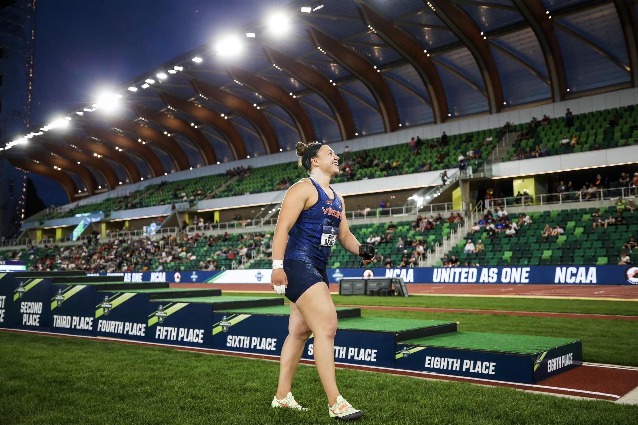 Deaviz entered a loaded field of shot putters with a seed mark of 17.32 meters which stood as a UVA record at the beginning of the day. That school record fell with Deaviz’ first throw of the day as she shattered the mark reaching 17.97 meters (58’11.5”). On the NCAA’s biggest stage, Deaviz was not shaken by the moment. In fact, her performance reached a new level entirely as she surpassed her previous best on four out of her six total attempts (17.97m, 17.96m, 17.57m, 17.91m).